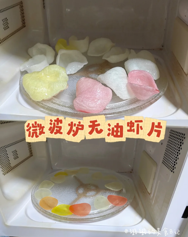 以前去东南亚餐厅总馋人家的虾片,现在用微波炉就能轻松复刻,将虾片直接放在转盘上,高火 40-50 秒就能叮出一小盆,还不用油炸!