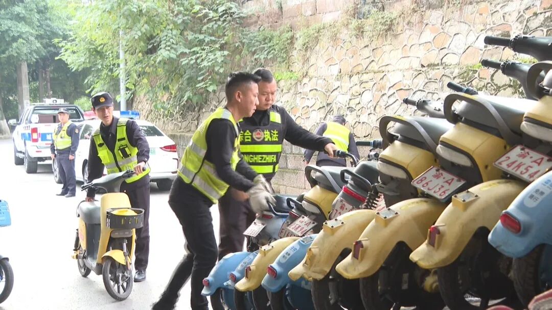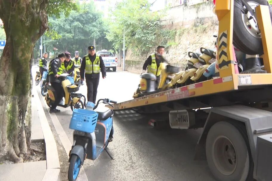 行动当天,整治组就出动20余人次、综合执法车4台次,在城区主要干道集中清理乱停放的共享电单车。同时在主要十字路口设检查点,重点排查电动车、摩托车驾驶人佩戴头盔情况。